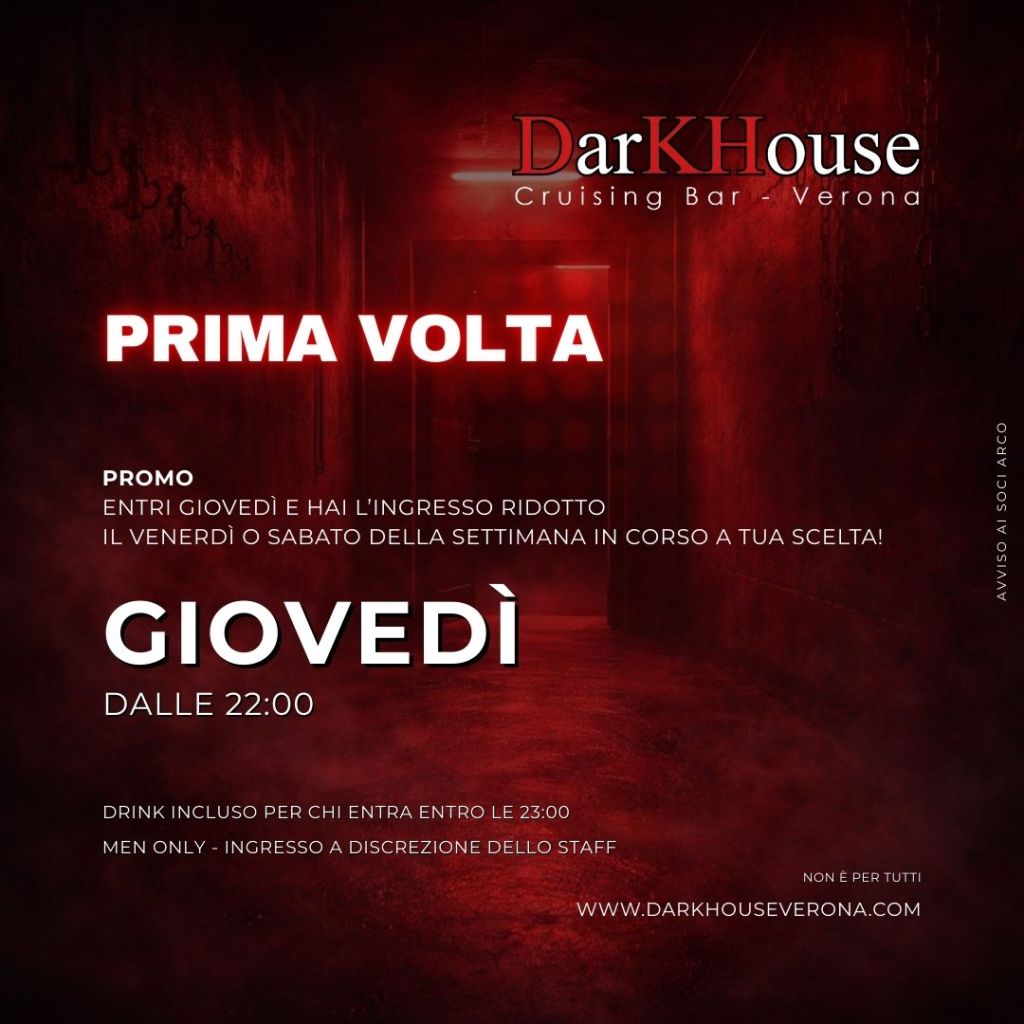 - Prima Volta: La serata ideale per entrare al DarkHouse per la prima volta. Atmosfera più soft e accessibile.